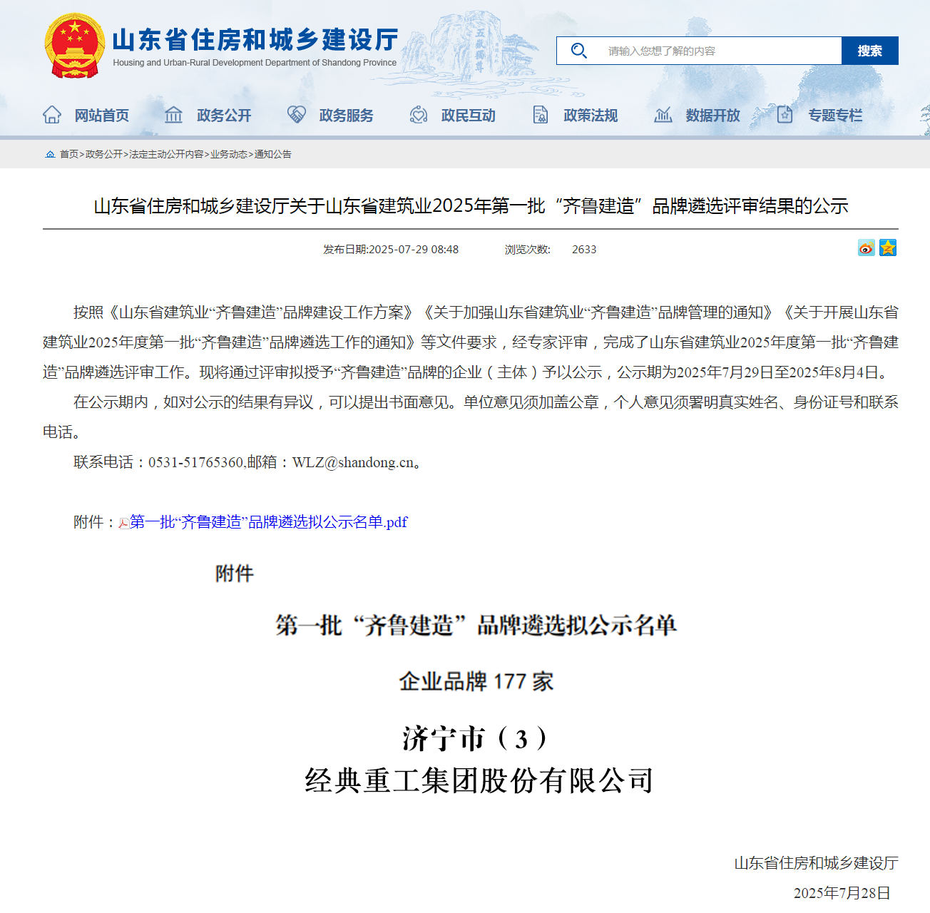 近日,山東省住房和城鄉(xiāng)建設(shè)廳正式公布2025年第一批“齊魯建造”品牌遴選名單,經(jīng)典重工集團(tuán)股份有限公司憑借在鋼結(jié)構(gòu)建筑部品建材領(lǐng)域的技術(shù)實(shí)力與品牌影響力,成功入選部品建材品牌名錄,這標(biāo)志著公司在推動(dòng)建筑產(chǎn)業(yè)現(xiàn)代化、智能化、綠色化發(fā)展方面的綜合實(shí)力又獲省級權(quán)威認(rèn)可。
