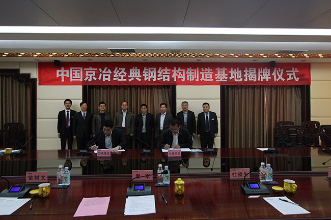 揭牌儀式前,中國(guó)京冶鋼結(jié)構(gòu)事業(yè)部常務(wù)副總經(jīng)理常好誦和經(jīng)典集團(tuán)董事長(zhǎng)苗樹(shù)文在公司三樓會(huì)議中心共同簽訂了戰(zhàn)略合作框架協(xié)議。中國(guó)京冶與經(jīng)典集團(tuán)將本著平等、誠(chéng)信、互惠、共贏的原則,利用各自優(yōu)勢(shì)在鋼結(jié)構(gòu)建筑領(lǐng)域建立長(zhǎng)期戰(zhàn)略合作伙伴關(guān)系,在高層、超高層鋼結(jié)構(gòu)建筑、大跨度鋼結(jié)構(gòu)建筑、鋼結(jié)構(gòu)住宅產(chǎn)業(yè)化、鋼結(jié)構(gòu)工程設(shè)計(jì)施工制造管理、節(jié)能環(huán)保維護(hù)系統(tǒng)等領(lǐng)域開(kāi)展項(xiàng)目工程合作、科研與技術(shù)合作。