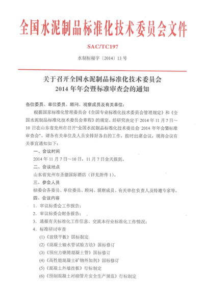 【會(huì)務(wù)公告】全國(guó)水泥制品標(biāo)準(zhǔn)化技術(shù)委員會(huì)2014年年會(huì)暨標(biāo)準(zhǔn)審查會(huì)