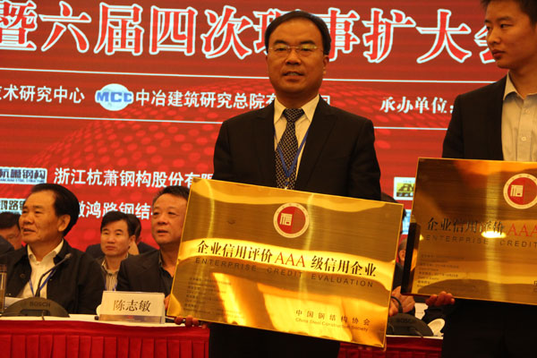 2014年10月26-27日,在南京國際會議中心隆重舉辦的中國鋼結(jié)構(gòu)協(xié)會成立三十周年紀(jì)念大會暨六屆四次理事會擴(kuò)大會議上,山東經(jīng)典重工集團(tuán)股份有限公司獲得首批全國鋼結(jié)構(gòu)行業(yè)AAA級信用企業(yè)。
