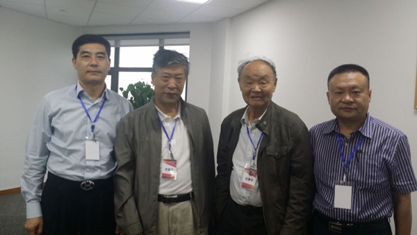 中國工程院馬克儉院士(右二),肖緒文院士(左二),山東建筑大學(xué)周學(xué)軍院長(右一)與董事長苗樹文(左一)合影