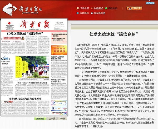 正如苗樹文所說,經(jīng)典重工的仁愛之德結(jié)出了碩果。今年4月,經(jīng)典重工的名號伴隨著她的一名普通員工———吳振興的名字響徹齊魯大地。4月2日經(jīng)典重工電工組工人吳振興在回家路上拾到一個裝有7000元現(xiàn)金的錢包,幾經(jīng)周折歸還失主。企業(yè)了解情況后專門召開2000多名員工參加的表彰大會,獎勵他1萬元愛心獎金。令人頗感意外的是,吳振興沒將這筆獎金帶回家,而是捐給了兗州的白血病患者文利。吳振興捐獻(xiàn)獎金讓企業(yè)上下震撼。“拾金不昧本身就是高尚的行為,又把獎金捐給需要的人,連續(xù)善行給集團(tuán)一個啟示:有錢一定要回報(bào)社會。”苗樹文說。4月10日,經(jīng)典重工派人來到文利家,為她捐款1萬元,又來到吳振興家,給他父母1萬元獎金,感謝兩位老人培養(yǎng)出品行如此優(yōu)秀的兒子。企業(yè)又拿出1000萬元成立愛心基金,用于扶困助殘、助學(xué)治病等。