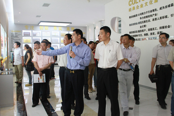 考察團一行參觀了經(jīng)典集團的文化館、項目中心、綜合辦公室、營銷中心和生產(chǎn)車間。苗樹文董事長向考察團介紹了經(jīng)典集團的生產(chǎn)經(jīng)營、項目建設(shè)、產(chǎn)學(xué)研合作、技術(shù)創(chuàng)新等情況。隨后,考察團一行實地參觀了經(jīng)典集團職工培訓(xùn)室、閱覽室、乒乓球室、臺球室、愛心超市和宴會廳,進(jìn)一步了解了企業(yè)的文化建設(shè)有關(guān)情況。