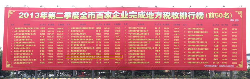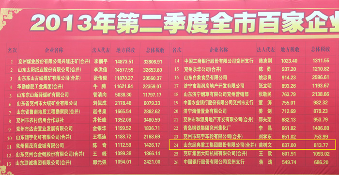 2013年7月7日,兗州市公布了第二季度納稅前50強(qiáng)企業(yè)排行榜,山東經(jīng)典重工集團(tuán)股份有限公司第二季度完成地方稅收637萬(wàn),總體稅收813.77萬(wàn),躍升兗州生產(chǎn)制造業(yè)前十強(qiáng)。全市排名第24位,比上一季度提升2位!