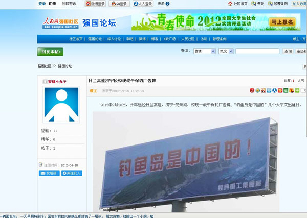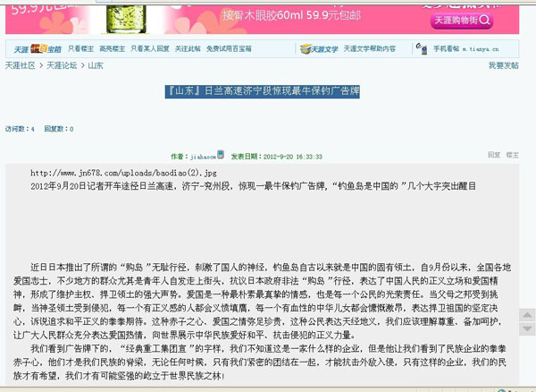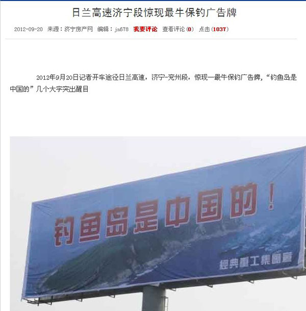 近一段時期以來日本推出了所謂的“購島”無恥行徑,刺激了國人的神經(jīng),我們集團作為中華民族大家庭的一員,有責(zé)任也有義務(wù)保衛(wèi)我們祖國領(lǐng)土的完整,和不容侵犯,為此集團領(lǐng)導(dǎo)代表集團全體員工通過各種方式彰示了我們的愛國熱情,并付諸于實際行動斥巨資在日蘭高速濟寧段制作了高炮廣告“釣魚島是中國的”以顯示我們保釣之決心。