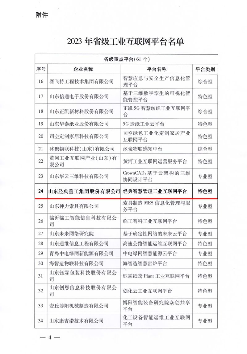 近日,山東省工業(yè)和信息化廳發(fā)布了《2023年省級工業(yè)互聯(lián)網(wǎng)平臺名單》,山東經(jīng)典重工集團股份有限公司“經(jīng)典智慧管理工業(yè)互聯(lián)網(wǎng)平臺”成功入選山東省級工業(yè)互聯(lián)網(wǎng)重點平臺名單。