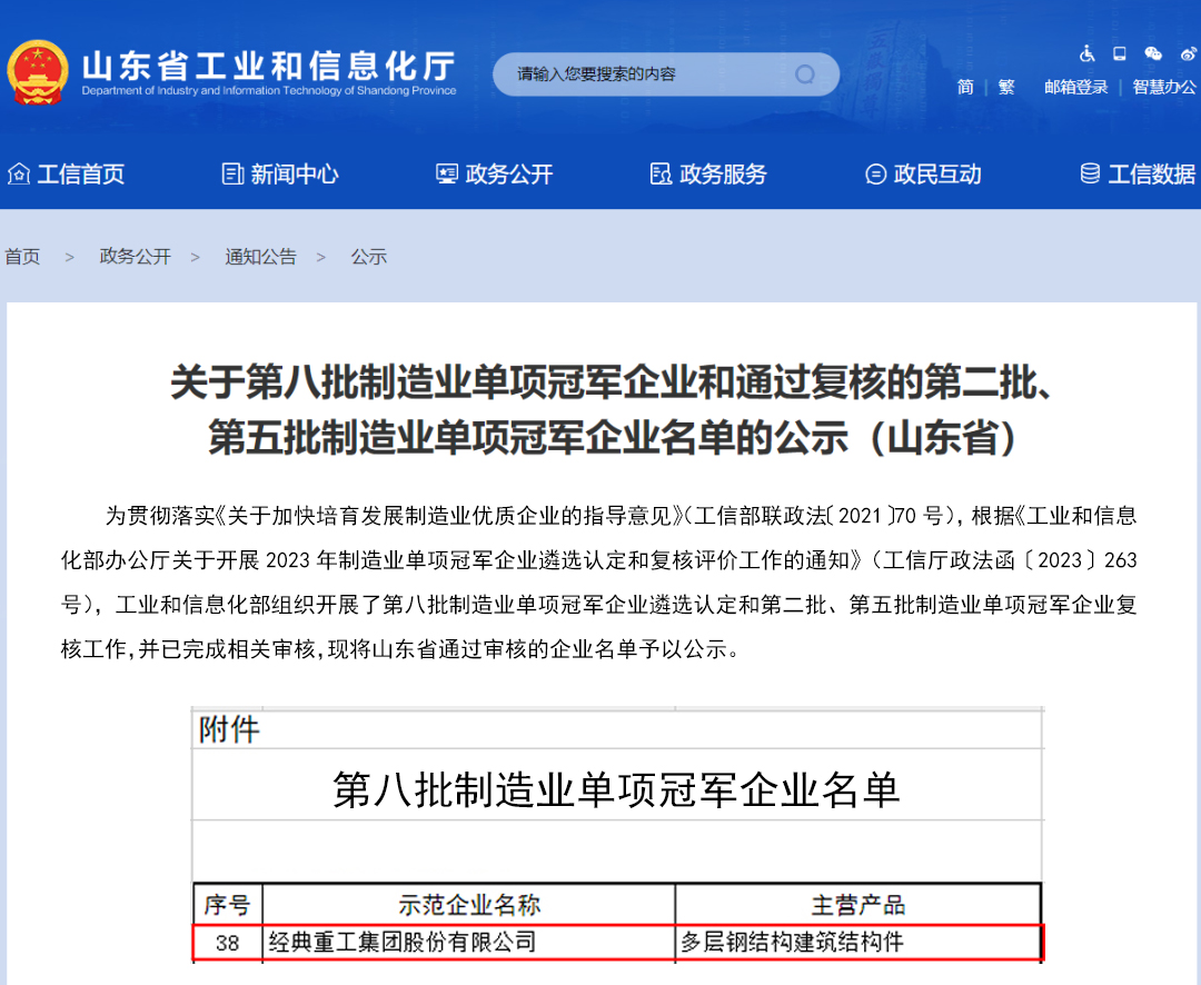 近日,工業(yè)和信息化部第八批制造業(yè)單項(xiàng)冠軍示范企業(yè)名單公示,經(jīng)典重工集團(tuán)股份有限公司位列其中,是該榮譽(yù)歷批次認(rèn)定中唯一一家建筑鋼結(jié)構(gòu)行業(yè)民營企業(yè)。
